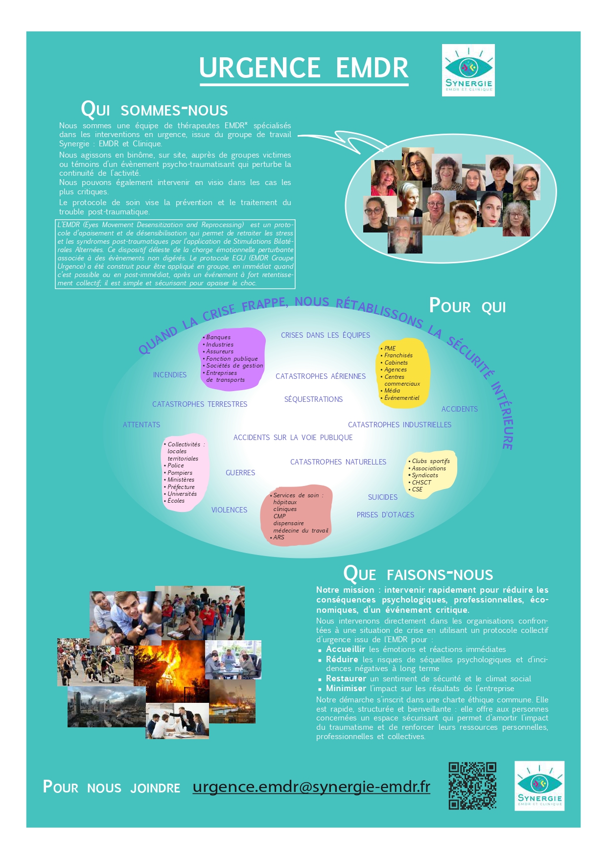Nous sommes une équipe de thérapeutes EMDR spécialisés dans les interventions en urgence, issue du groupe de travail Synergie : EMDR et Clinique. Nous agissons en binôme, sur site, auprès de groupes victimes ou témoins d’un évènement psycho-traumatisant qui perturbe la continuité de l’activité. Nous pouvons également intervenir en visio dans les cas les plus critiques. Le protocole de soin vise la prévention et le traitement du trouble post-traumatique.